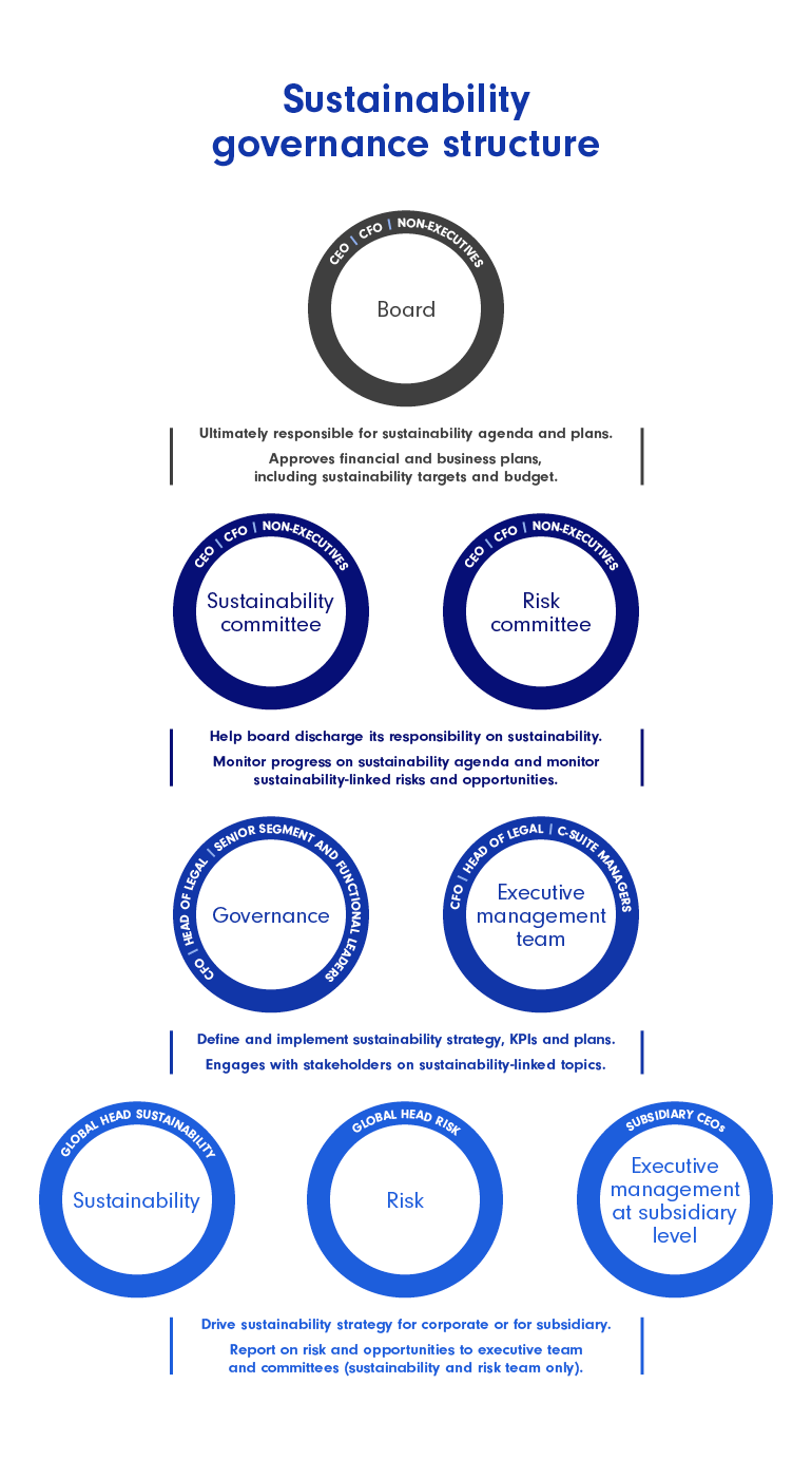 The board retains oversight of the sustainability agenda for the group, including our climate action strategy and plan. In addition, the review and approval of business and financial goals, including sustainability targets and resource allocations, are steered by relevant board committees.